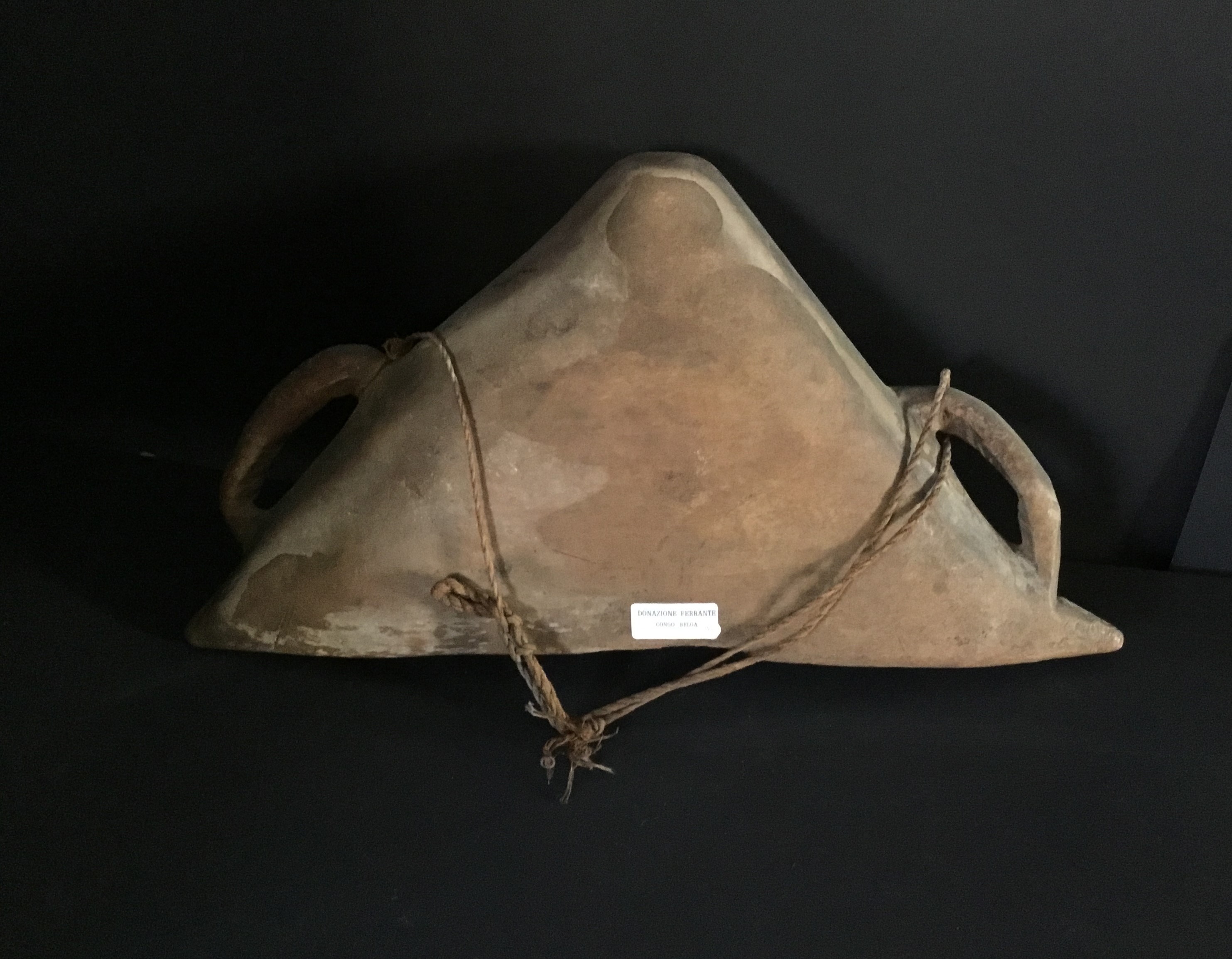 Di forma a triangolo isoscele, liscio, possiede un profondo incavo prodotto all'interno dell'unico pezzo da cui è ricavato, compresi i due manici che si trovano ai bordi.